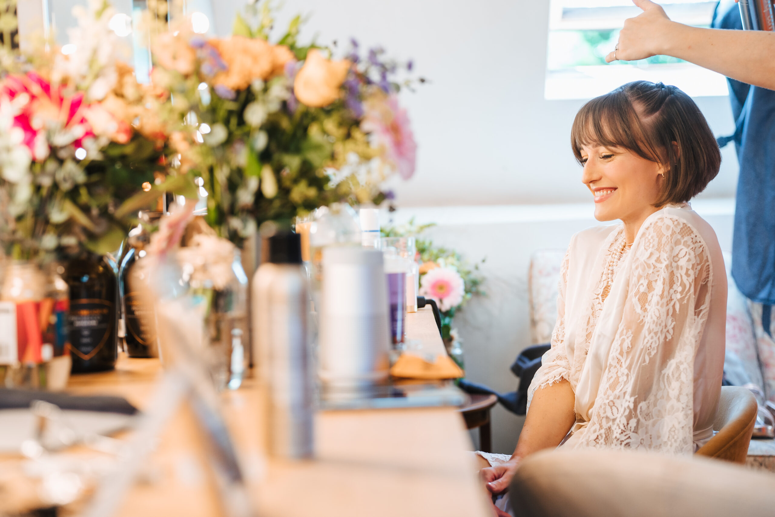 There is artificial light from our styling mirrors, and also natural light from the skylights, so stylists can choose which light they need. And most importantly, a little window so that you can see directly into the Cyder Barn below, as preparations for the ceremony take shape.