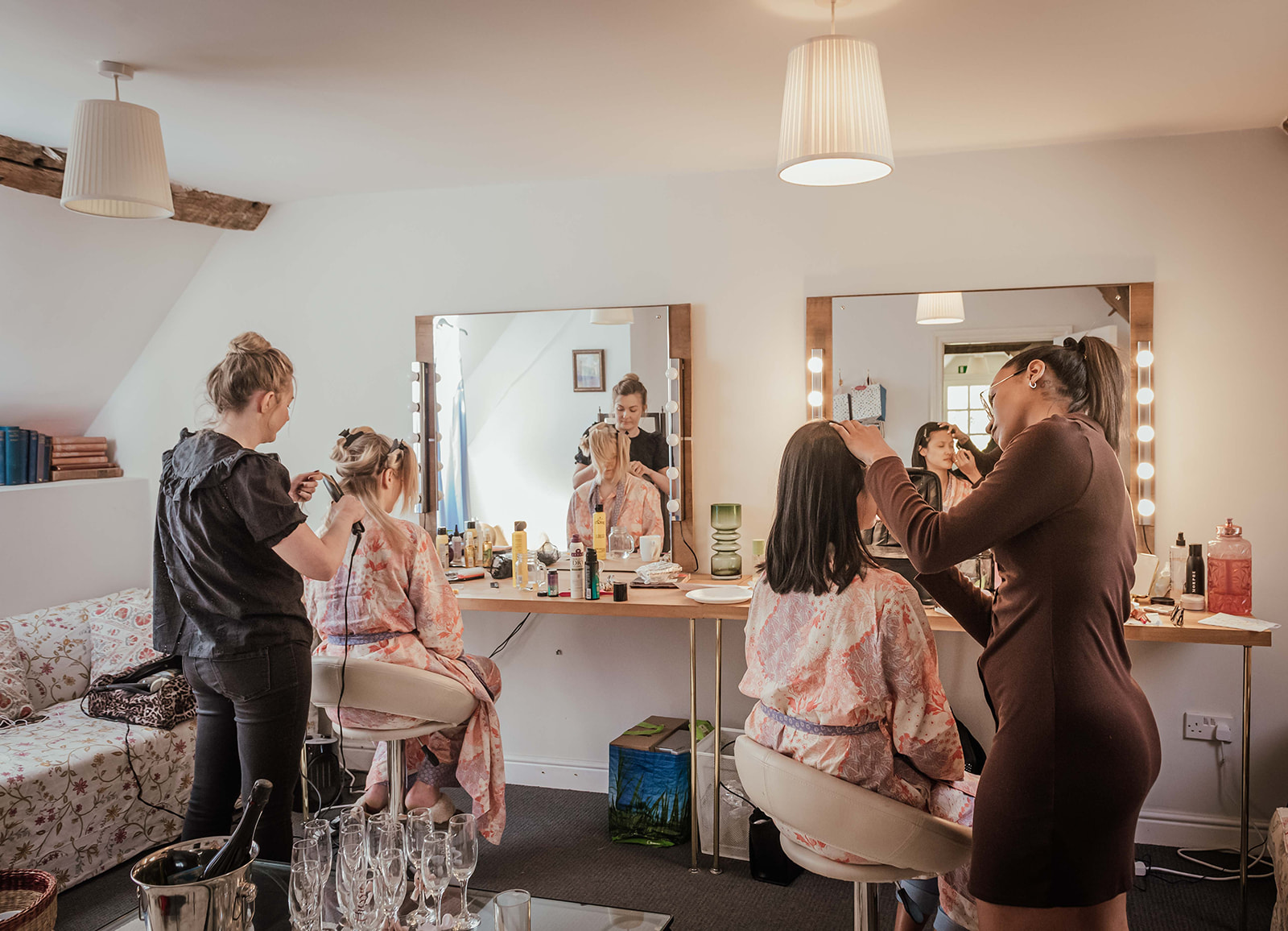 - Space for up to ten people with vanity mirrors and full-length cheval mirrors