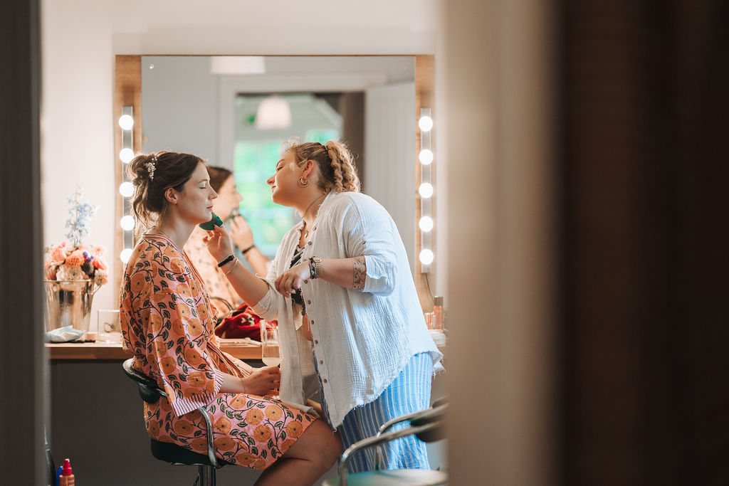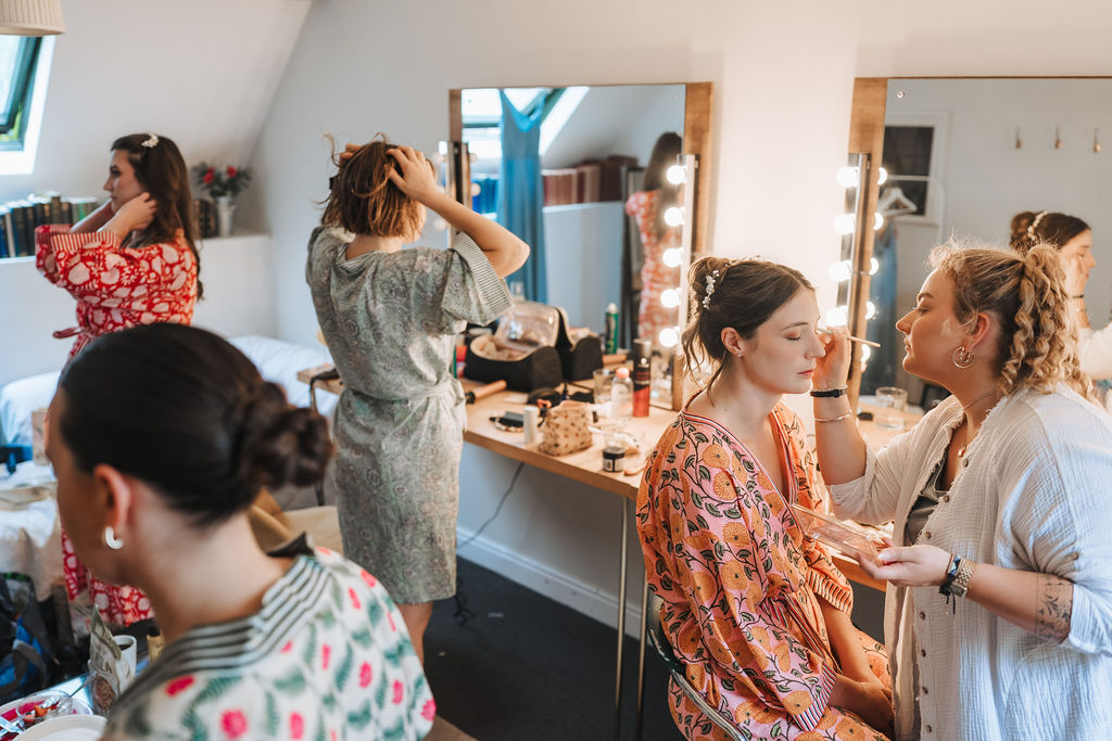 This is the hive activity on the morning of a wedding day. Often the hubbub and excitement starts as early as 6am, when make-up artists and hair stylists come to work their magic on our amazing couples. It is in the historic Cyder Barn at the heart of the Owlpen valley, and right down the corridor is the Apple Loft which our marital suite – you can find out more about that space by clicking the link below.