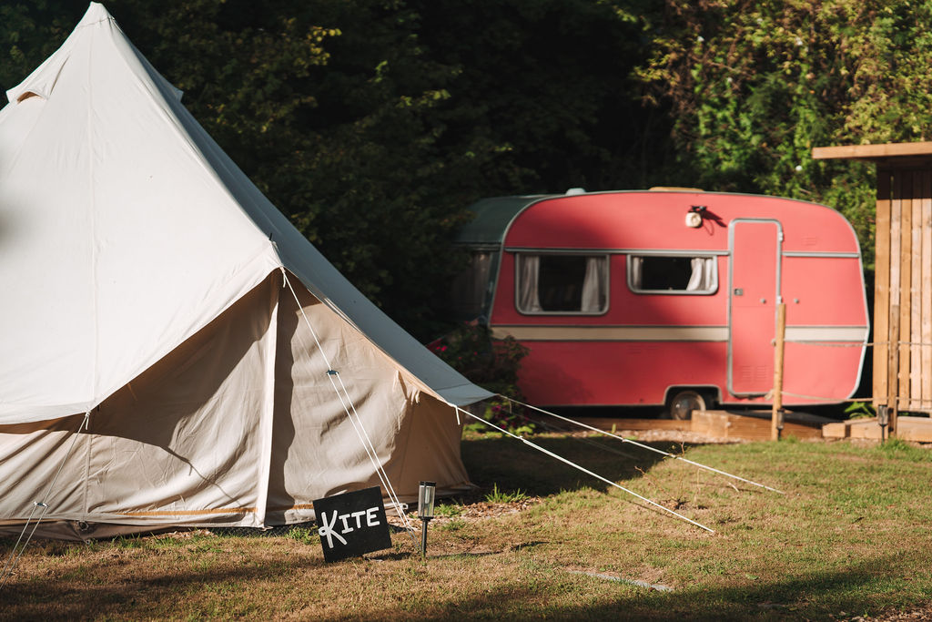 We have five bluxurious bell tents, all with proper beds, mattresses and comfy linen for your delectation. Enjoy hot showers, a BBQ and kitchen area, and our cute caravan boudoir which is the perfect place for getting ready and charging devices.